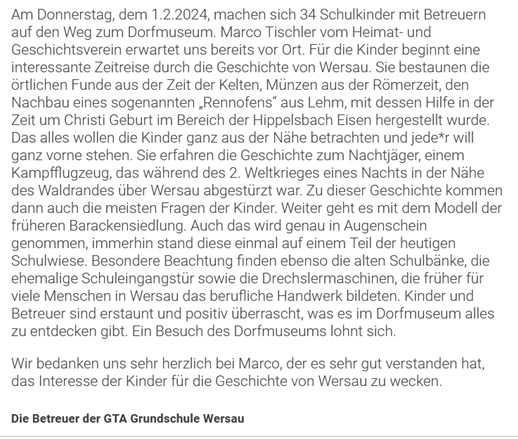 Am 28.9.2023 fand auf unserem Sportplatz in Wersau der Projekttag Trixitt statt. Bei schönstem Sonnenschein waren verschiedene Bewegungsstationen für uns Wersauer Grundschüler aufgebaut. Nach dem Aufwärmen ging es mit fetziger Musik in zwei Gruppen (Flex 1/2 und Kombi 3/ 4) zu den Angeboten. Am meisten hat uns der aufblasbare Bewegungsparcours gefallen, aber auch der „Menschentischkicker“, das Zweifelderballspiel, das gemeinsame Tanzen und das Tonnenwerfen machte viel Spaß. Zur Stärkung hat uns der Förderverein Wasser und Obst vorbeigebracht. Dankeschön! Am Ende haben wir alle zusammen jede Menge Bewegungspunkte gesammelt und uns dabei auch noch in Fairness geübt.