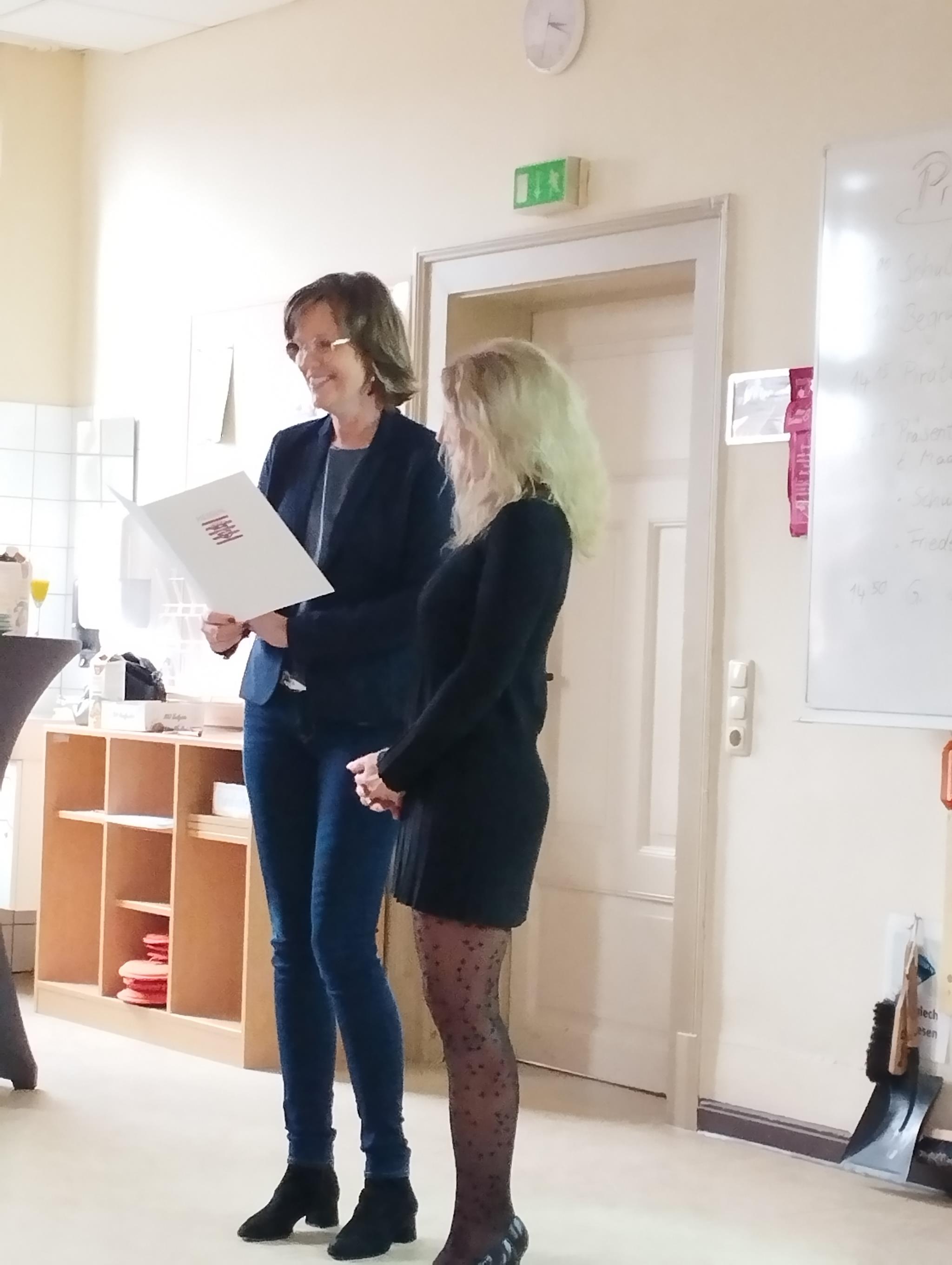 Nach Redebeiträgen unseres Bürgermeisters, sowie einem Vertreter des Odenwaldkreises, überreichte schließlich unsere Schulamtsdezernentin, Carolin Thelen, die Urkunde, sowie ein Präsent für die Schule.