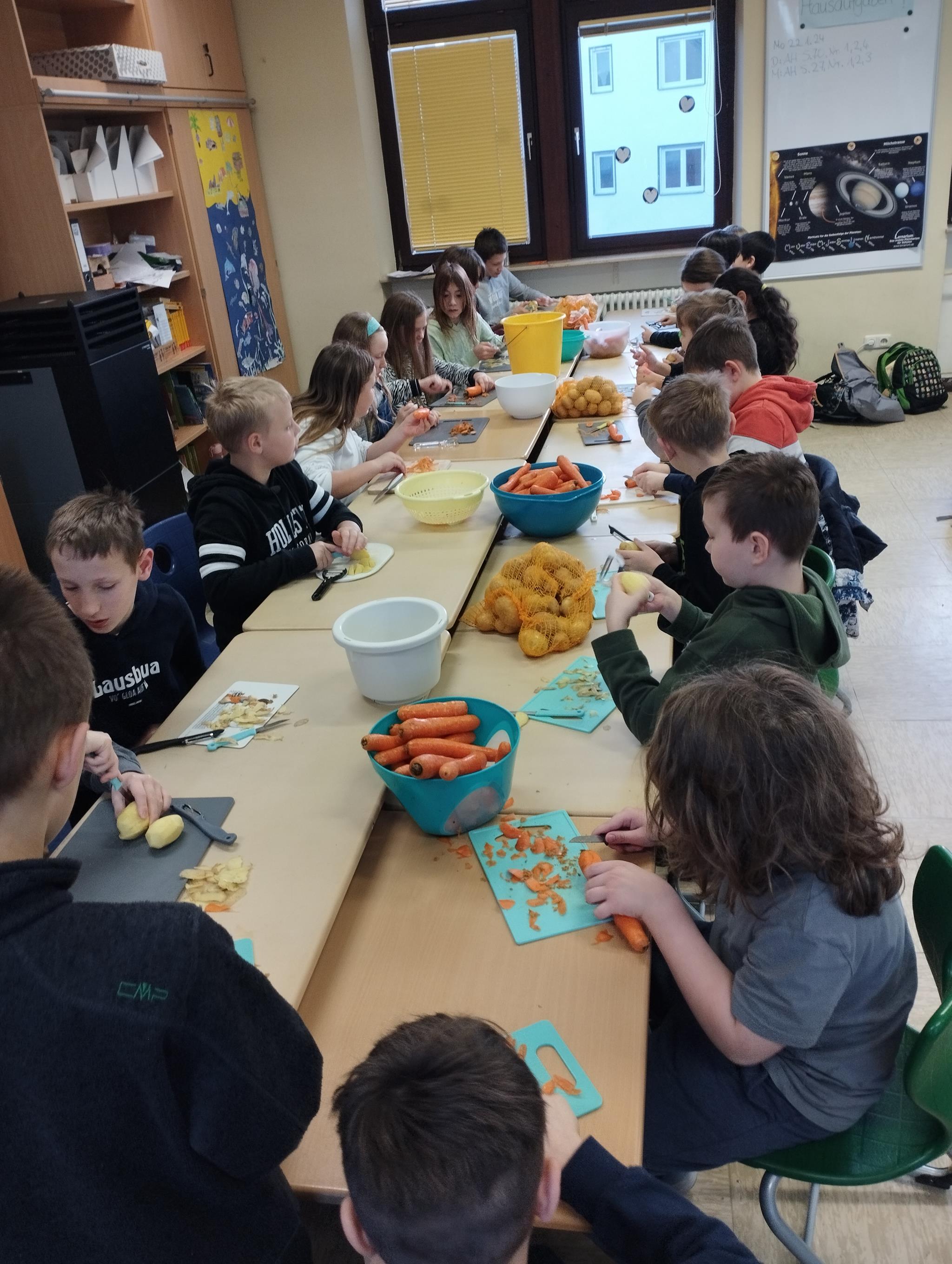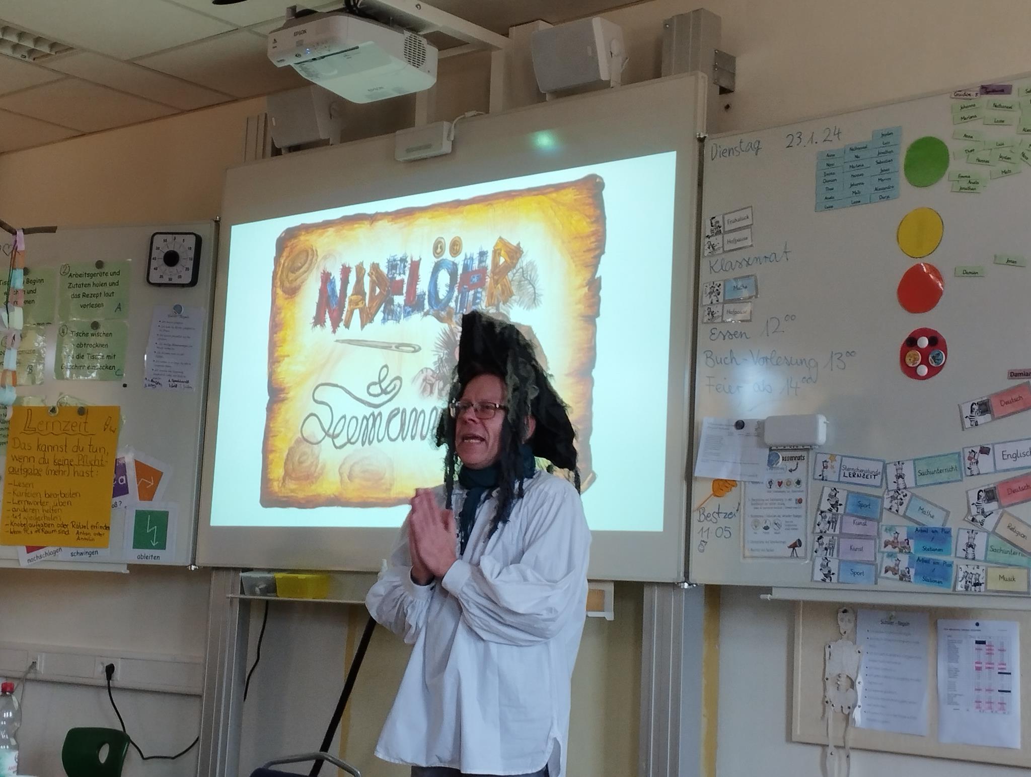 Hierzu gab es am 23.01.2024 eine Feierstunde. Der Vormittag begann für die Schülerinnen und Schüler der Klasse 3/4 mit dem "Schnippeln" des Gemüses für eine leckere Gemüsesuppe, die von unserem fleißigen GTA-Team zubereitet wurde. Im Anschluss an den Unterricht fand zunächst für alle Kinder eine Lesung des Autors Oliver Hülsermann statt, der sein spannendes Buch "Nadelöhr und Seemannsgarn" vorstellte. Danach wurde die Suppe gegessen, die bei allen Anwesenden große Begeisterung auslöste.
