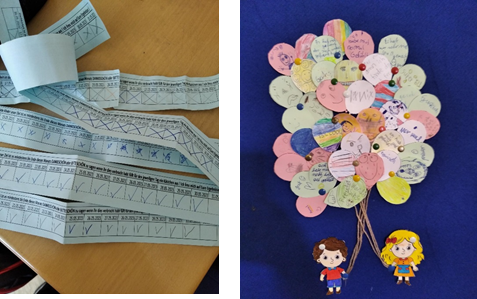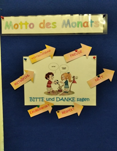 Dies haben wir durch die Selbstkontrolle der SchülerInnen ausgerichtet, indem alle eine „Danke-Bitte“ Tabelle ausgefüllt haben. Am Ende des Monats wollten wir die Gefühle, welche sie bei der Tat hatten, auswerten. Ihre Gefühle haben die Schüler auf kleine Ballonvorlagen versucht zu beschriften. Diese haben wir an die Pinnwand an der Eingangstür der Schule aufgehängt.