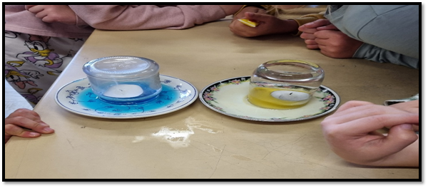Die Schüler*innen konnten das zusammen Kooperieren der zwei Elemente beobachten. Den Kindern wurde bewusst das Feuer Sauerstoff benötigt, um zu brennen.