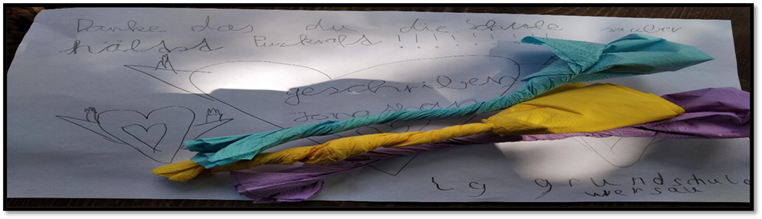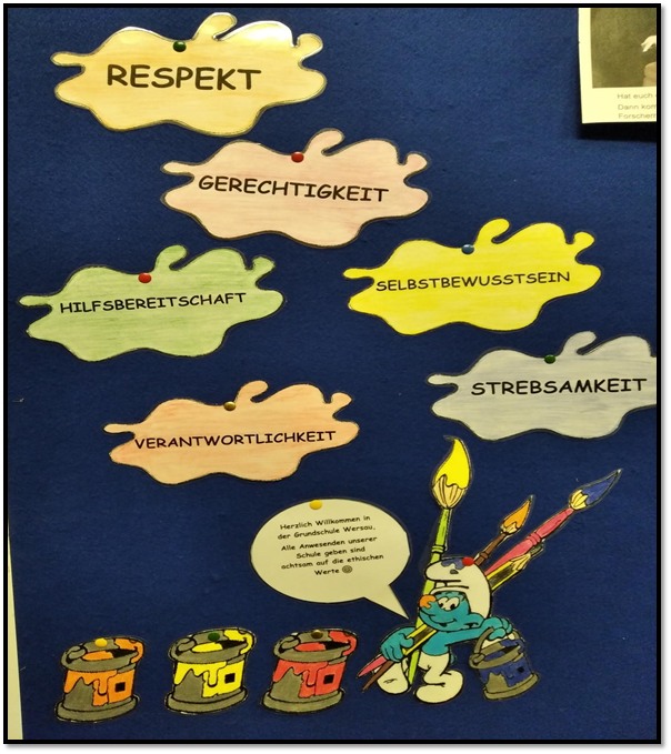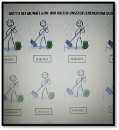 Dies haben wir durch die Selbstkontrolle des Schülers ausgerichtet, indem das Ausfüllen einer „Ich halte mein Lebensraum“ Tabelle ausgeführt haben. Am Ende des Monats wurden die Tabellen mit Stickern bewertet. Den Abschluss dieses Mottos haben die 3. Und 4. Klässler am Tag der Bundesjugendspiele den ganzen Müll auf dem Weg zum Sportplatz mit Gummihandschuhen und Mülltüten gesammelt. Die Flex-Klasse hat als Abschluss aus Servietten Rosen gebastelt und diese an die Personen geschenkt welches Ihre Umgebung sauber halten dazu gehören Familie, Hausmeister der Schule, die Putzkraft der Schule etc…