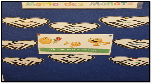 Dies haben wir durch die Selbstkontrolle der SchülerInnen ausgerichtet, indem alle eine „Danke-Bitte“ Tabelle ausgefüllt haben. Am Ende des Monats wollten wir die Gefühle, welche sie bei der Tat hatten, auswerten. Ihre Gefühle haben die Schüler auf kleine Ballonvorlagen versucht zu beschriften. Diese haben wir an die Pinnwand an der Eingangstür der Schule aufgehängt.
