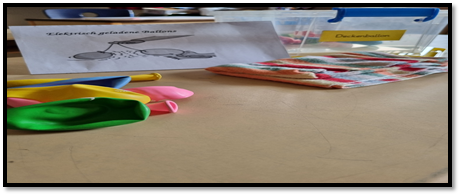 Das aneinander reiben des Filztuches und der geblasenen Ballons hat für eine kurze Zeit das Haften des Ballons an der Wand gesorgt. Mit diesem Experiment haben die Kinder die Auswirkungen der Reibungselektrizität gelernt.